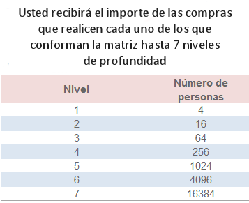 Pues bien, esta construcción lógica de su arreglo matricial se repite en los niveles subsecuentes, así tenemos que usted tendrá 64 personas en su tercer nivel, 256 en su cuarto nivel, 1024 personas en su quinto nivel, 4096 personas en su sexto nivel y 16384 personas en su séptimo nivel.